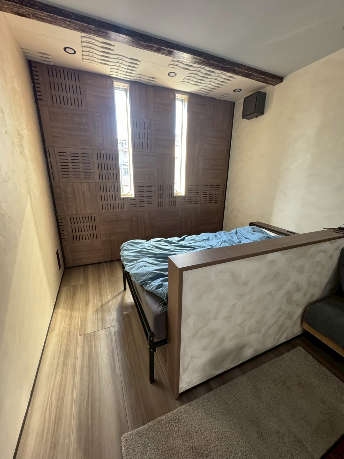 ベッド区画・シアター区画・水回り区画が扉のない一続きの空間になっています。